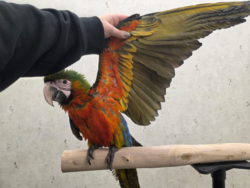 Door hun grootte zijn het geen vogels om de gehele dag in een kooi te leven, ze zijn gebouwd om te kunnen vliegen! Voor hun welzijn en (ook uw) plezier is het belangrijk dat ze regelmatig lekker kunnen vliegen. Daarom worden al onze ara's voorbereid om straks vrij buiten te kunnen vliegen (Free flight). Ze zijn al handtam, stappen goed op en mogen ook bijna dagelijks buiten vliegen in een grote overnette tuin zodat ze al gewend zijn aan het buiten zijn en hun vlieg-skills al op jonge leeftijd goed kunnen trainen.