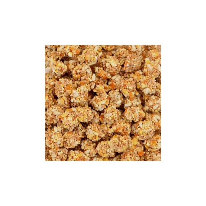 Samenstelling: Gepelde witte sojagierst, gebroken maïs, gedroogd fruit (papaja, ananas, mango), saffloer, gemalen maïs, maltodextrine, sojameel, rode gierst, tarwemeel, pinda's, maïssiroop, glycerine, dicalciumfosfaat, gemalen kalksteen, canolaolie, gehydrolyseerd soja-eiwit, gemalen rijst, maïsglutenmeel, carrageen, gejodeerd zout, DL-methionine, citroenzuur, natuurlijke kleurstof, Xanthaangom, Choline Chloride, Vitamine E-supplement, Ascorbinezuur, Niacine-supplement, Manganous Oxide, Beta-Caroteen, Zinkoxide, D-Calcium Pantothenaat, Biotine, Riboflavine-supplement, Natriumseleniet, Pyridoxine Hydrochloride, Vitamine A-supplement, Thiamine Mononitraat, Vitamine B12-supplement, Tocoferolen, Foliumzuur, Koper Methionine Chelaat, Vitamine D3-supplement.